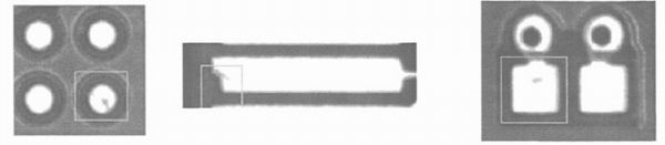 l.左图是一个导电的触点,它可以是一个过孔(Routing Via)或是球栅阵列(BGA,Ball Girl Array)的一个点。如是过孔Via的瑕疵,那可能是孔化上锡的工艺问题,在两层板之间电信号传导可能会不通;如是球栅阵列BGA的瑕疵,那因为BGA是通过机械电接触导通,显然就会无法电接触了。我们将此类瑕疵归于BGA类的针孔(Pin Hole)瑕疵。
