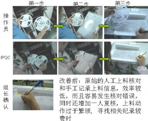 改善后:使用扫描器简短的几秒钟时间即完成上料的核对和手工记录,也省掉复核人力1人,即方便快捷又能很好防止作业不认真导致的错料;是不是感觉很轻松?下面我们来看看改善前的情况;